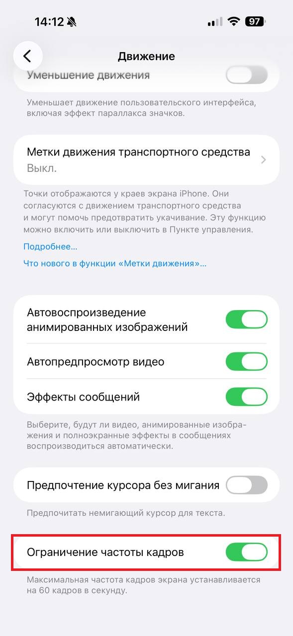 Если у вас Pro-модель iPhone с экраном 120 Гц, можно попробовать ограничить частоту обновления до 60 Гц. В повседневном использовании это помогает немного сэкономить заряд, особенно если вы много листаете ленты, чаты, сайты и другие интерфейсы, где экран постоянно находится в движении.